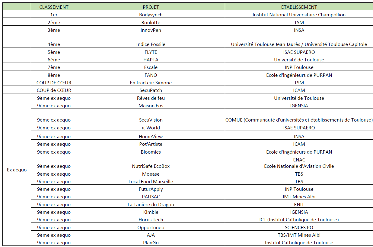Tous les étudiants ont été récompensés. Près de 27 000 € de prix ont été attribués, grâce notamment au soutien des partenaires financiers : Banque Populaire Occitane, Barreau des Avocats de Toulouse, Crédit Agricole Toulouse 31, Le Catalyseur, Nubbo l’incubateur, Ordre des Experts Comptables, Sopra Steria.